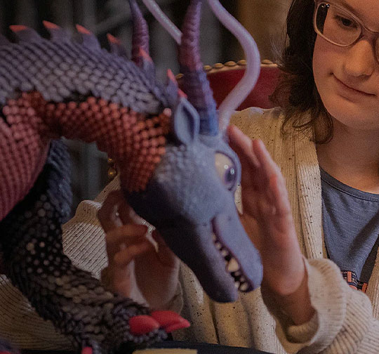 The dragon’s eye is fashioned from thin layers of plastic that were hand-painted to convey the deeper expressions of a live pet. The eyelid motions are controlled by tiny motors in the head and programmed animations.