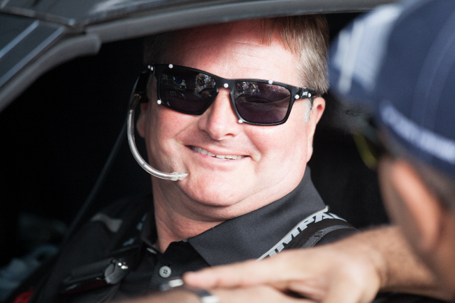 Sam greets drivers Pato O’Ward and Felix Rosenqvist.