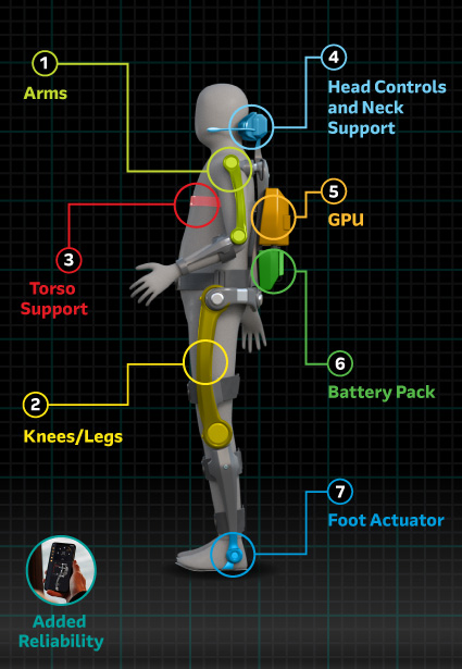 - Body Landmark Sensors: This network of infrared, motion-capture, and color-identifying cameras essentially creates a field of coverage and helps capture Sam’s movements as he walks. Through the incorporation of machine-learning technology, the exoskeleton’s CPU can use this information to better refine the SAM Suit’s movements and avoidance abilities.