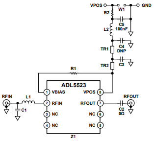• ADL5523-EVALZ, Evaluation Board is a fully populated, 4-layer, FR4-based evaluation board. For normal operation it requires a single 5 V/100 mA power supply. The 5V power supply should be connected to the test loops labeled VPOS and GND. Alternatively, the power supply connections may be made via the two pin header, W-1. The RF input is applied to the SMA connector labeled RFIN. The RF output is available at the SMA connector labeled RFOUT