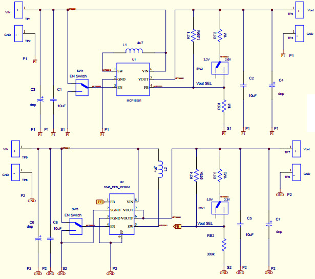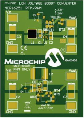 - ADM00458, Evaluation Board used to evaluate and demonstrate the MCP16251 and MCP1640B Synchronous Boost Converters. This board demonstrates the MCP16251/MCP1640B in two boost-converter applications with multiple output voltages. It can be used to evaluate both package options (SOT-23-6 and 2x3 mm 8-(T)DFN). The MCP16251 and MCP1640B Synchronous Boost Converters Evaluation Board was developed to help engineers reduce the product design cycle time. Three common output voltages can be selected: 2.0V, 3.3V and 5.0V. The output voltage can be changed with a mini-dip switch that changes the external resistor divider. A switch connected to the EN pin is used to enable and disable the converters