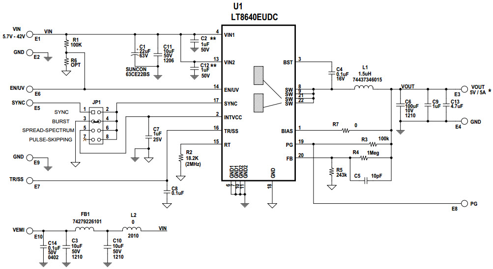 - DC2202A, Demonstration circuit 2202A is a 42V, 5A Micro-power synchronous step-down Silent Switcher with spread spectrum frequency modulation featuring the LT8640. The demo board is designed for 5V output from a 5.7V to 42V input. The wide input range allows a variety of input sources, such as automotive batteries and industrial supplies. The LT8640 is a compact, Ultra Low emission, high efficiency and high speed synchronous monolithic step-down switching regulator. The integrated power switches and inclusion of all necessary circuitry reduce the components count and solution size