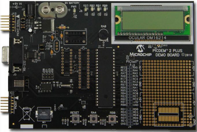 DM163022, PICDEM 2 Plus Board demonstrates the capabilities of 8-bit microcontrollers, specifically, 18-, 28- and 40-pin PIC16FXXX, PIC16F1XXX and PIC18 devices