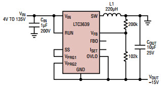 LTC3639_Typical ApplicationTypical Application Using LTC3639MPMSE 4 to 135V Input to -15V Output Positive-to-Negative Regulator |