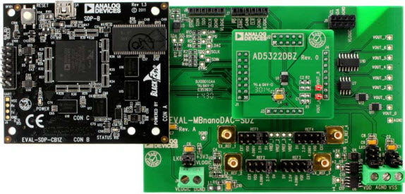 - EVAL-AD5322DBZ, Evaluation Board for the AD5322 dual-channel, voltage output, digital-to-analog converter (DAC). The evaluation board is designed to help users quickly prototype new AD5322 circuits and reduce design time. The AD5322 operates from a single 2.5 to 5.5 V supply. The evaluation board interfaces to the USB port of a PC via the SDP-B board