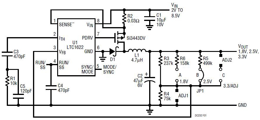 - Demo board DC232 is a step-down (buck) regulator using the LTC1622. The exclusive use of surface mount components results in a highly efficient application in a very small board space. It is ideal for cell phones and other portable electronics operating from one or two Li-Ion cells or three to six NiCd cells. DC232 is capable of providing 1.5A at an output voltage of 2.5V with an input supply of 4.2V