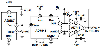 • Typical Application Circuit for AD587KRZ-REEL7 Low Power Voltage Reference, 12-Bit CMOS DAC Application. The AD587 is ideal for applications with 10-bit and 12-bit multiplying CMOS DACs. The AD587 is paired with the AD7545 12-bit multiplying DAC and the AD711 high speed BiFET op amp. The amplifier DAC configuration produces a unipolar 0V to -10V output range