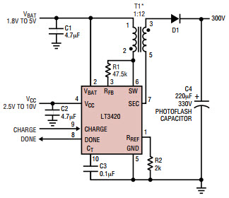 • Typical Application Circuit for LT3420 Photoflash Charging Circuit Uses Small Transformer. The LT3420 charge high voltage photoflash capacitors quickly and efficiently. Designed for use in both Digital and film cameras, these devices use a flyback topology to achieve efficiencies up to four times better than competing flash modules. A unique adaptive off-time control algorithm maintains current-limited continuous mode transformer operation throughout the entire charge cycle, eliminating the high inrush current often found in modules