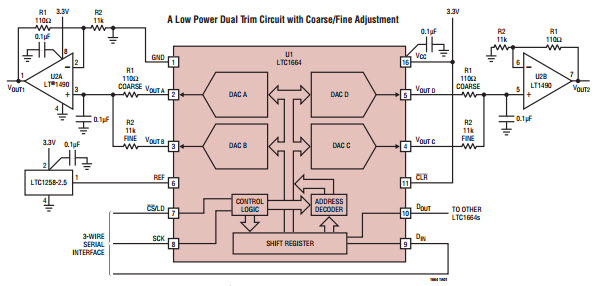 • Typical Application for LTC1664IN Micro-power Quad 10-Bit DAC for a Low Power Dual Trim Circuit with Coarse/Fine Adjustment