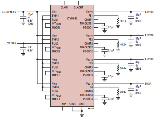 • Typical Application for LTM4643IV 2.375V to 5V Input, Quad 1V, 1.2V, 1.5V, 1.8V Output Step-Down Regulator. The LTM4643 is a quad DC/DC step-down regulator with 3A per output. Outputs can be paralleled in an array for up to 12A capability. Included in the package are the switching controllers, power FETs, inductors and support components
