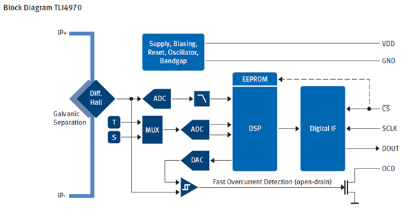 Small 7.0 x 7.0 mm SMD package - The TLI4970 provides superior accuracy compared to existing open or closed loop systems with magnetic cores. It has additional functionality such as overcurrent detection, zero crossing detection and programmable filters, but offers a significantly smaller footprint and power consumption.