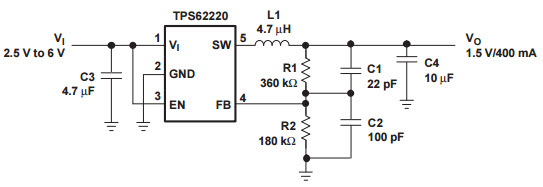 - Typical Application (LI-Ion to 1.5-V Conversion) for TPS62224DDC 400-mA, 1.25-Mhz, High-Efficiency, Step-Down Converter. The TPS6222x devices are a family of high-efficiency, synchronous step-down converters ideally suited for portable systems powered by 1-cell Li-Ion or 3-cell NiMH/NiCd batteries. The devices are also suitable to operate from a standard 3.3V or 5V voltage rail