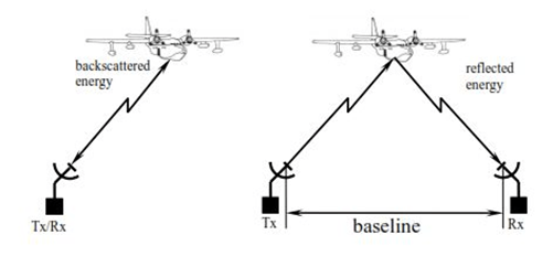 Figure 3: Monostatic (left) and bistatic (right) radar systems