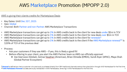 Incentives and co-sell opportunities. AWS and IBM both provide incentives and marketing development funds (MDF) tied to Marketplace transactions. For example, AWS often pays hyperscaler incentives up front and may offer end-user rebates or credits for eligible purchases.