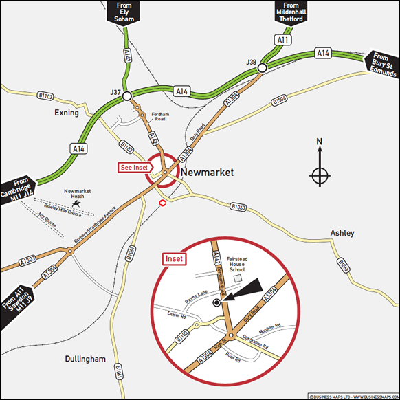 Leave the M11 at Junction 14 (signed Newmarket & A14). Join the A14 towards Newmarket. Remain on the A14 for 16 miles until the junction with the A142 (J37) to the north of Newmarket. Turn right onto the A142 (Fordham Road) towards Newmarket Town Centre and continue for 1 ½ miles, passing over two roundabouts. We are situated in the large red building on the right hand side between GMS and Waitrose.
