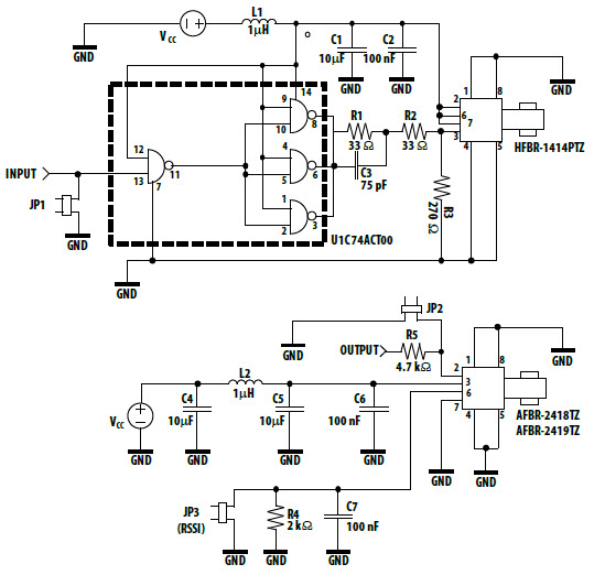 Progetto di riferimento usando la parte HFBR-1414PTZ di Broadcom Inc