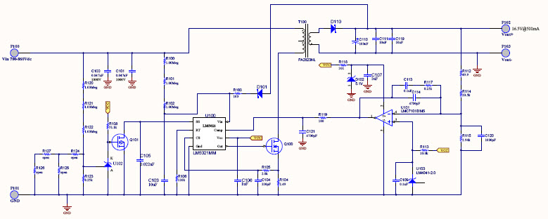 - PMP7769, Reference Design is a non isolated flyback converter. Vin is 700V to 800V max, converting to 16.5V out at a maximum current of 500mA. The design utilizes an external Error amplifier using an LMC7101 for feedback control. The LM5021 features include an ultra-low (25A) start-up current, which minimizes power losses in the high voltage start-up network. A skip cycle mode reduces power consumption with light loads for energy conserving applications