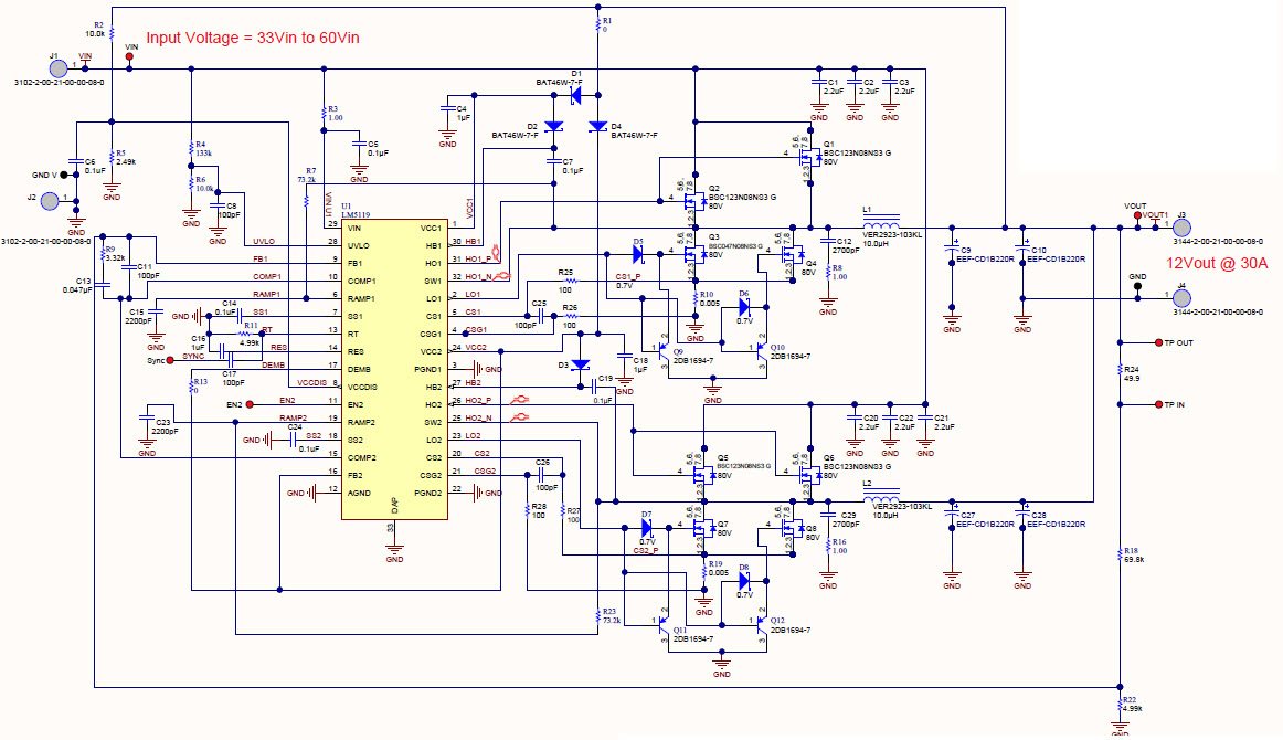 • PMP7990, A dual-phase synchronous buck converter accepting an input voltage of 33Vin to 60Vin and providing an output of 12Vout capable of supplying 30A