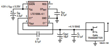 • Typical Application Circuit for LTC1550LCS8-2.5 -4.1V Output GaAs FET Bias Generator. The LTC1550L is a switched capacitor charge pump voltage inverters which include internal linear post regulators to minimize output ripple. The LTC155xL fixed output voltage versions include -4V, -2.5V and -2V with ripple voltages typically below 1mVP-P