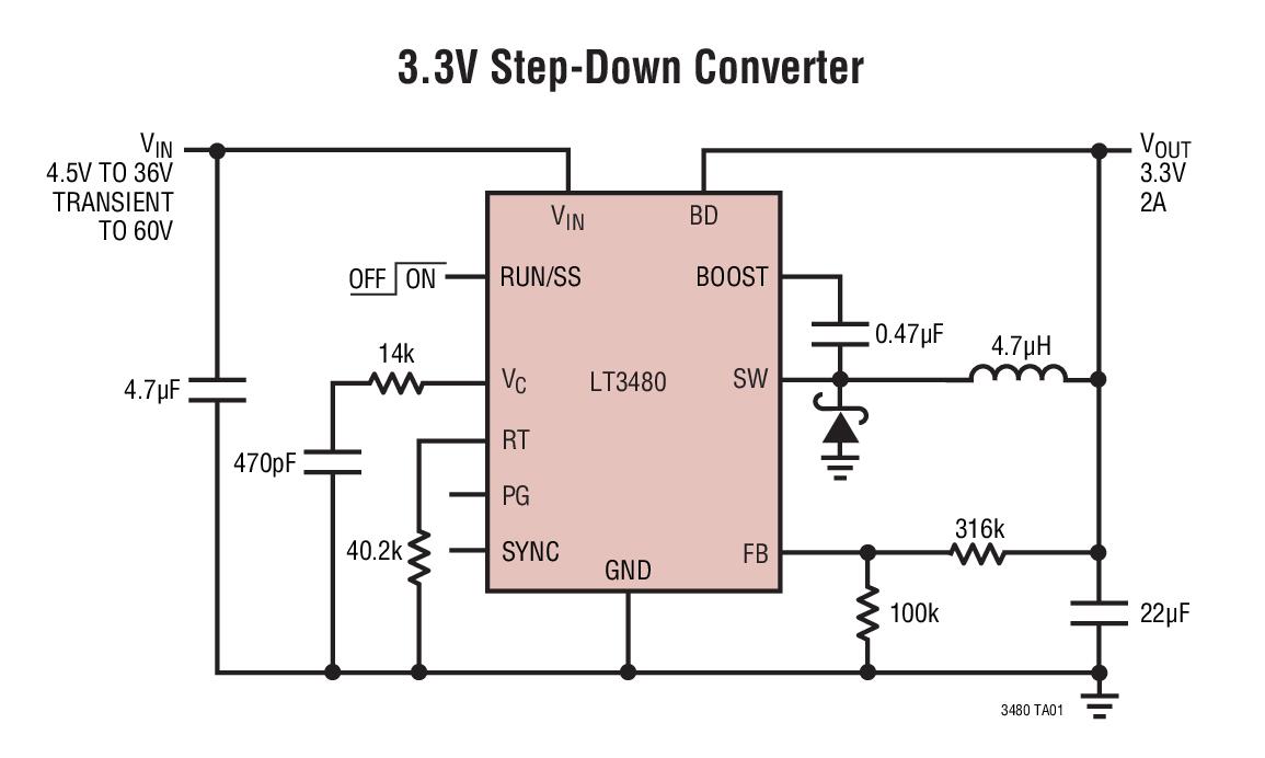 - Typical Application for LT3480 - 36V, 2A, 2.4MHz Step-Down Switching Regulator with 70 uA Quiescent Current. The LT3480 is an adjustable frequency (200kHz to 2.4MHz) monolithic buck switching regulator that accepts input voltages up to 36V (60V maximum). A high efficiency 0.25 switch is included on the die along with a boost Schottky diode and the necessary oscillator, control, and logic circuitry. Current mode topology is used for fast transient response and good loop stability. Low ripple Burst Mode operation maintains high efficiency at low output currents while keeping output ripple below 15mV in a typical application
