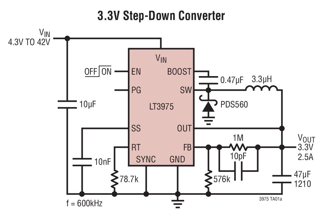 - Typical Application for LT3975 - 42V, 2.5A, 2MHz Step-Down Switching Regulator with 2.7 uA Quiescent Current. The LT3975 is an adjustable frequency monolithic buck switching regulator that accepts a wide input voltage range up to 42V. Low quiescent current design consumes only 2.7uA of supply current while regulating with no load. Low ripple Burst Mode operation maintains high efficiency at low output currents while keeping the output ripple below 15mV in a typical application. The LT3975 can supply up to 2.5A of load current and has current limit foldback to limit power dissipation during short circuit. A low dropout voltage of 500mV is maintained when the input voltage drops below the programmed output voltage, such as during automotive cold crank