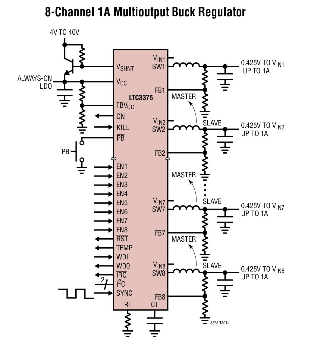 - Typical Application for LTC3375 - 8-Channel Programmable, Parallelable 1A Buck DC/DCs. The LTC3375 is a digitally programmable high efficiency multioutput power supply IC. The DC/DCs consist of eight synchronous buck converters (IOUT up to 1A each) all powered from independent 2.25V to 5.5V input supplies