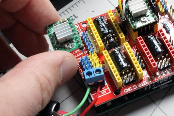 Caption: Grbl shield and driver modules. Note microstepping jumper.