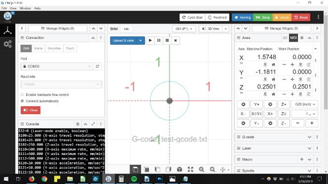 In addition to running the grbl on an Arduino, you’ll need to run software on your computer to communicate with your machine. You have many programs to choose from, but I decided to try a software program called “CNCjs,” and I was pleased with its results. With your Arduino connected, log on by selecting the appropriate COM port and Baud rate, which will be 115200 in the case of grbl1.1f.
