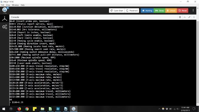 You can modify settings, such as steps/mm, in the console, and you can examine them by typing “$$” enter. To modify the variables, enter $X=Y. For example, setting 100 (which is steps/mm) is modified by inputting $100=50, setting this to 50steps/mm.