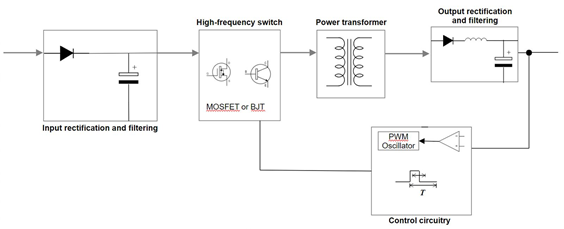The diagram above outlines how the SMPS operates. An SMPS’s functionality is more complex than that of a linear regulator, but we can break it down into five stages: