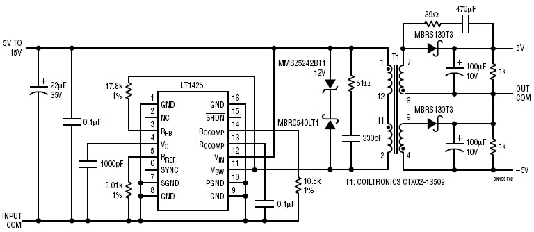 - Circuit shows LT1425, Circuit shows a 5V supply with 1.5kV of isolation. The sum of line/load/cross regulation is better than 3%. Full load efficiency is between 72% (VIN = 5V) and 80% (VIN = 15V)