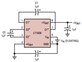 - Typical Application Circuit for LT1026IS8 Voltage Quadrupler. The LT1026 is a switched capacitor voltage doubler and inverter on a single monolithic die. Capable of operating from a 4V to 10V input, it provides ±7V to ±18V output. Output currents of over 10mA are available. Two charge pumps first double the input voltage then invert the doubled voltage. Manufactured in bipolar technology, the LT1026 is not susceptible to latch up and generates up to 36V