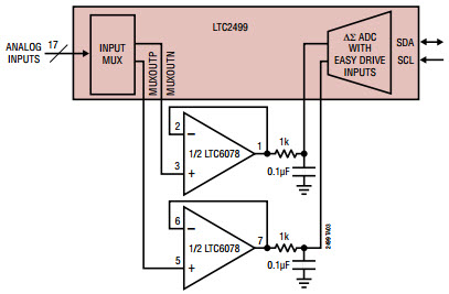 - Typical Application Circuit for LTC2499IUHF 24-Bit, 16-Channel ADC with External Buffers Provide High Impedance Inputs. The LTC2499 is a 16-channel (eight differential), 24-bit, No Latency ADC with Easy Drive technology and a 2-wire, I2C interface