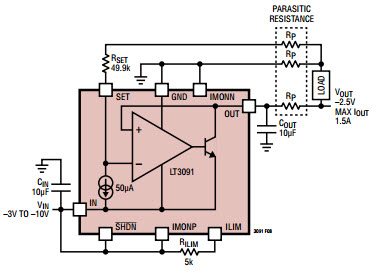 - Typical Application for LT3091MPFE Connections for Best Load Regulation. The LT3091 is a 1.5A, low dropout negative linear regulator that is easily paralleled to increase output current or spread heat on surface mounted boards. Designed with a precision current reference followed by a high performance rail-to-rail voltage buffer, this regulator finds use in applications requiring precision output, high current with no heat sink, output adjustability to zero and low dropout voltage